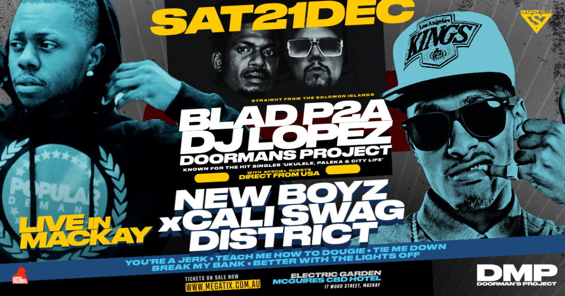 Get ready, Mackay! The stage is about to heat up like never before as an epic lineup of hip hop and reggae royalty takes over the city for one unforgettable night. On Saturday, December 21st, join us for the LIVE debut performance in Mackay of BLAD P2A & DJ LOPEZ OF DMP, CALI SWAG DISTRICT, and NEW BOYZ!