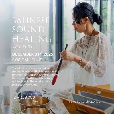 On December 31st, 2025, embark on a transformative journey of Balinese Sound Healing with the talented Sofia. Experience the vibrant vibrations of seven chakra singing bowls and Balinese mantras, which promote healing and balance at the physical, emotional, and spiritual levels. This immersive session will guide you to a state of profound peace and harmony, leaving you feeling rejuvenated and centered as you welcome the new year. Secure your spot now to live better and live longer.