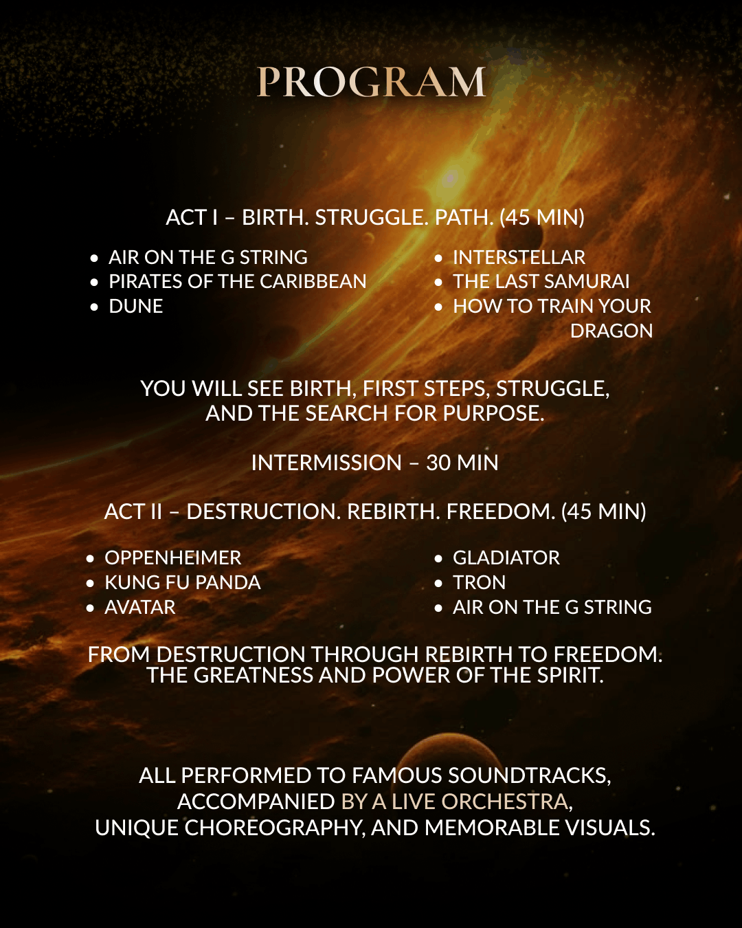 It’s a big, bright show full of energy, light, and emotion. We bring the music you love — from famous movies — to life on stage through dance and live sound.