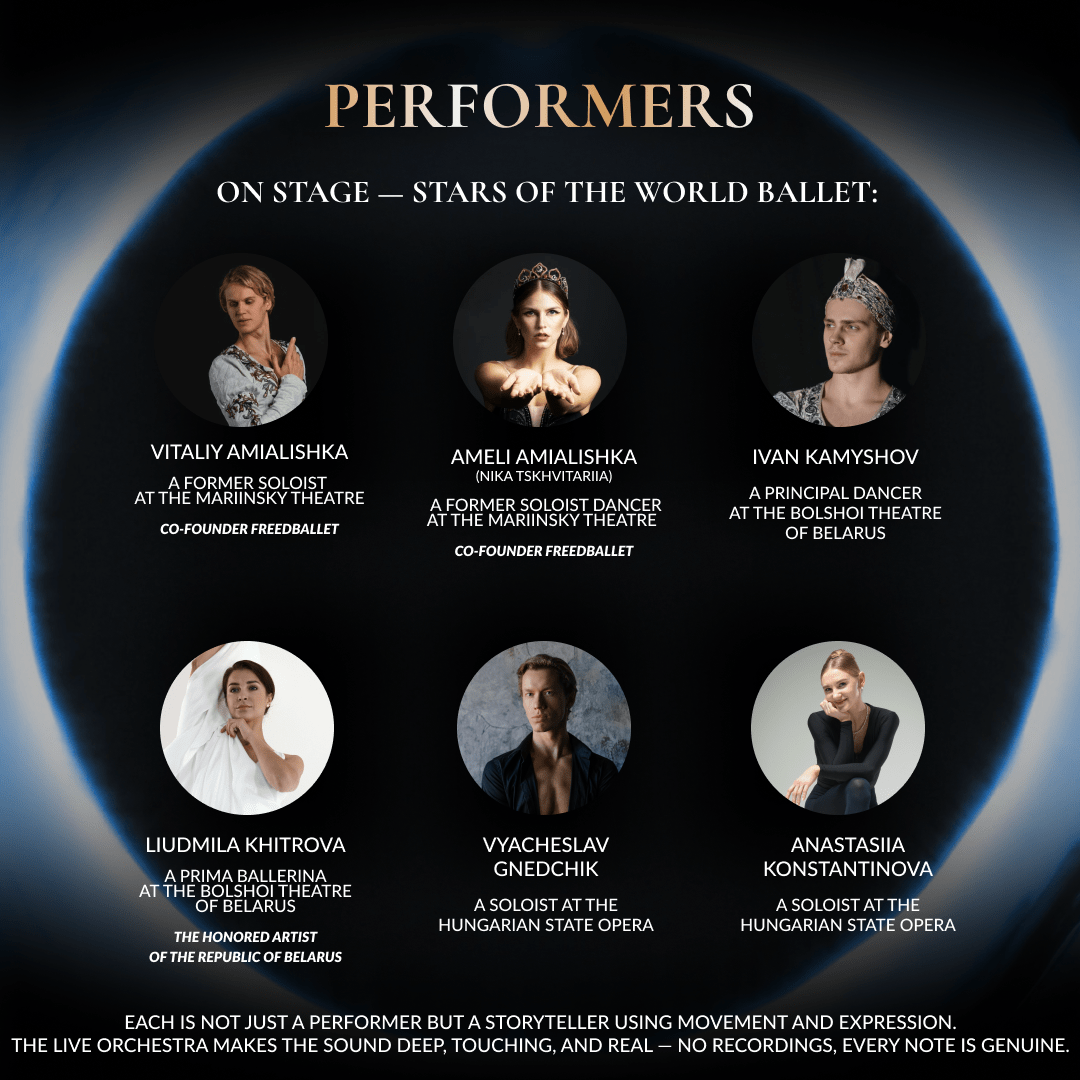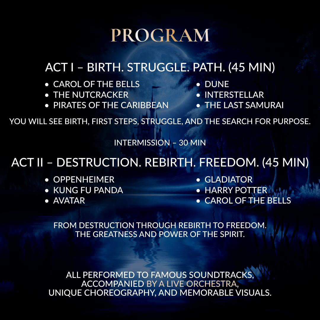 UNIQUE NEW YEAR'S SHOW featuring world BALLET STARS performing with a LIVE ORCHESTRA, playing famous film SOUNDTRACKS by composers such as Hans Zimmer, Ludwig Göransson, James Horner, and Pyotr Ilyich Tchaikovsky.