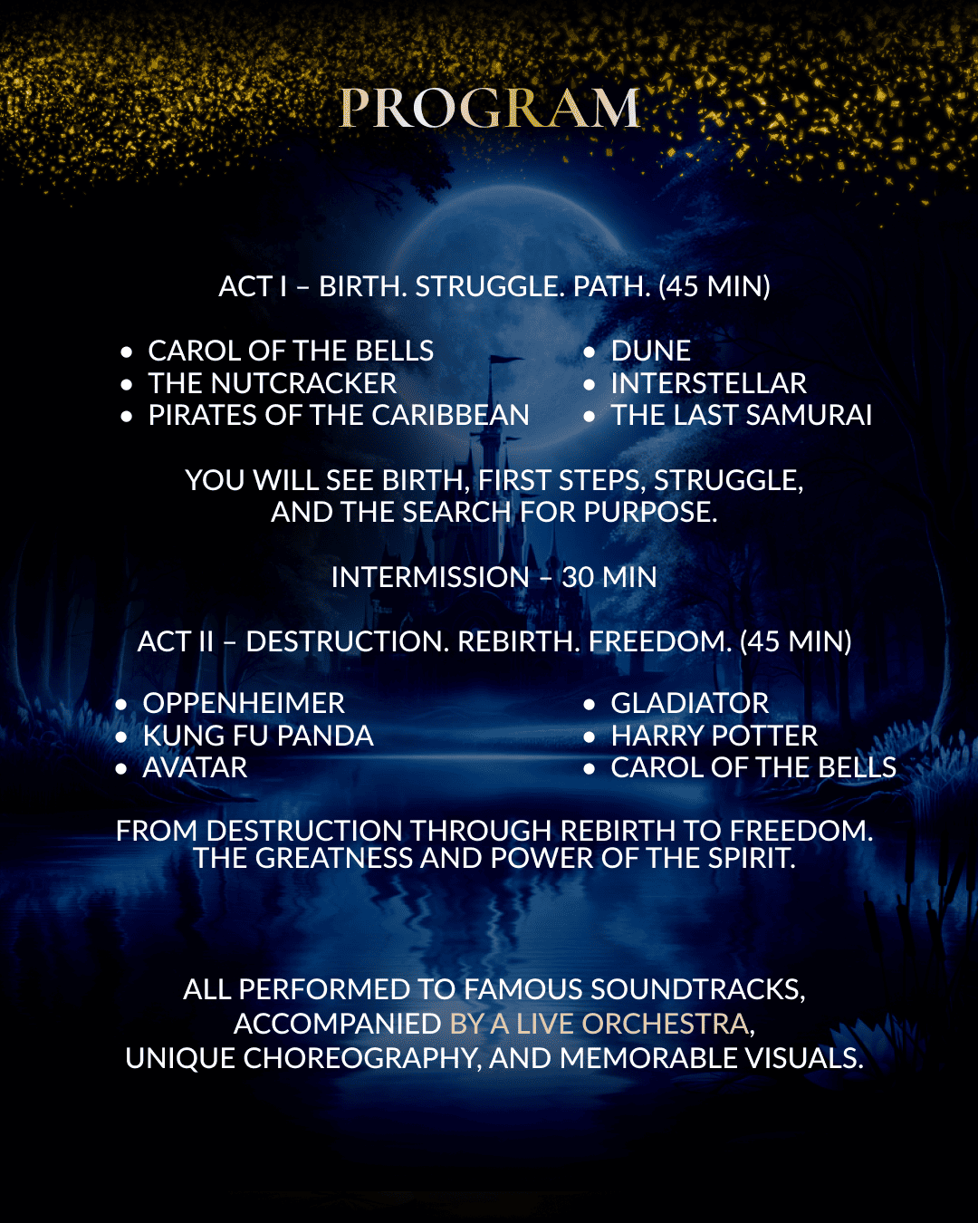 It’s a big, bright show full of energy, light, and emotion. We bring the music you love — from famous movies — to life on stage through dance and live sound.