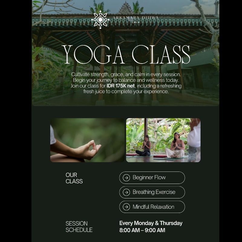 Begin your journey to balance and wellness with our guided yoga experience in a serene tropical setting.