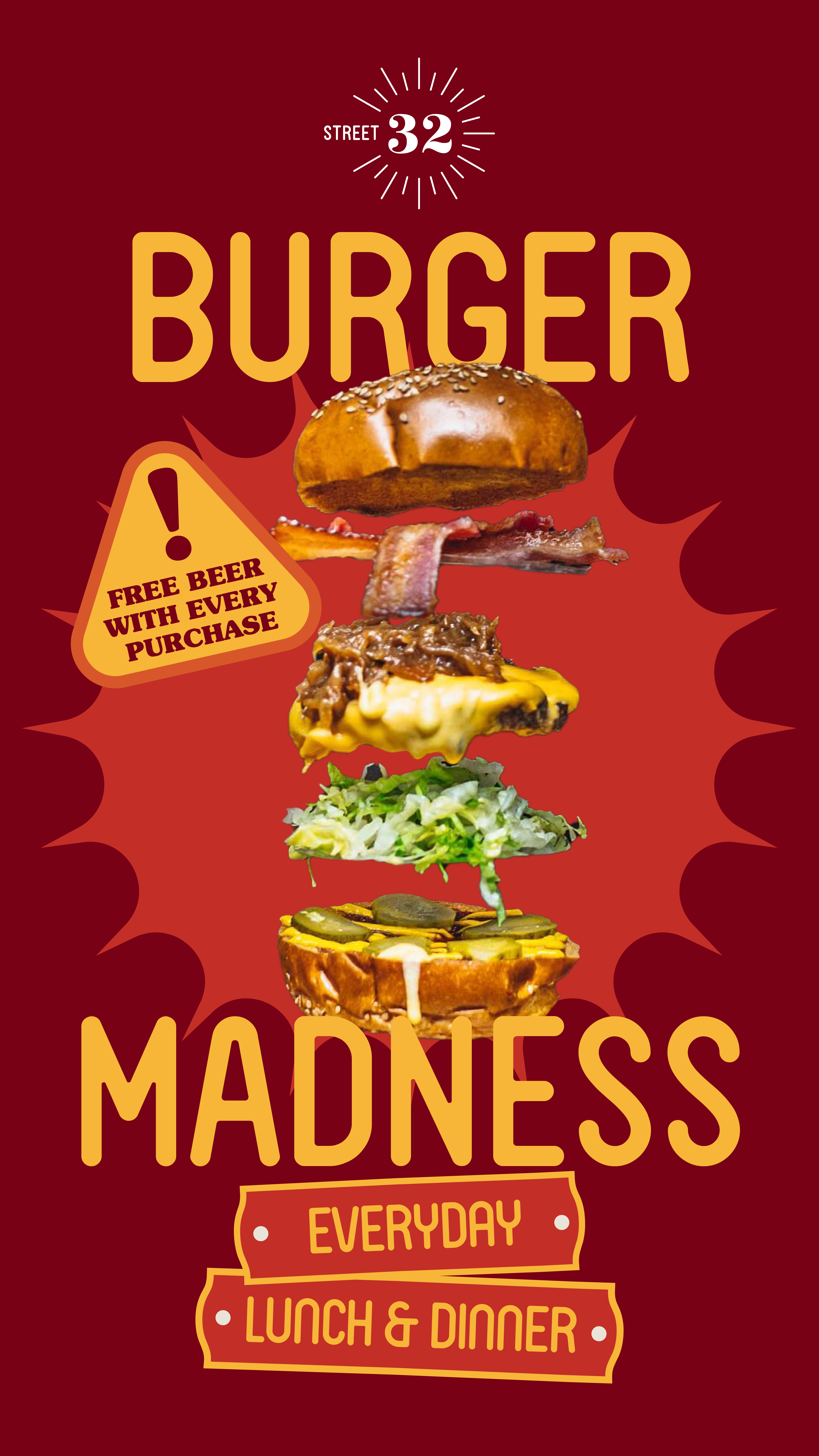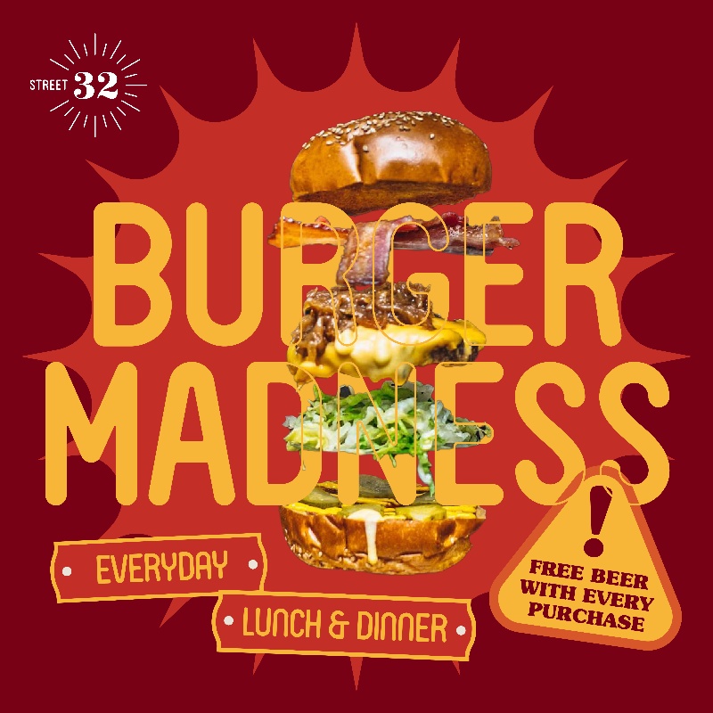 Burger season hits different when the deal goes this hard. Your week just got an upgrade with Burger Madness at Street 32. Pick your favorite stack, bite in, and enjoy a cold beer on the house. Monday to Thursday. Lunch or dinner. Zero excuses, just good food done right.
