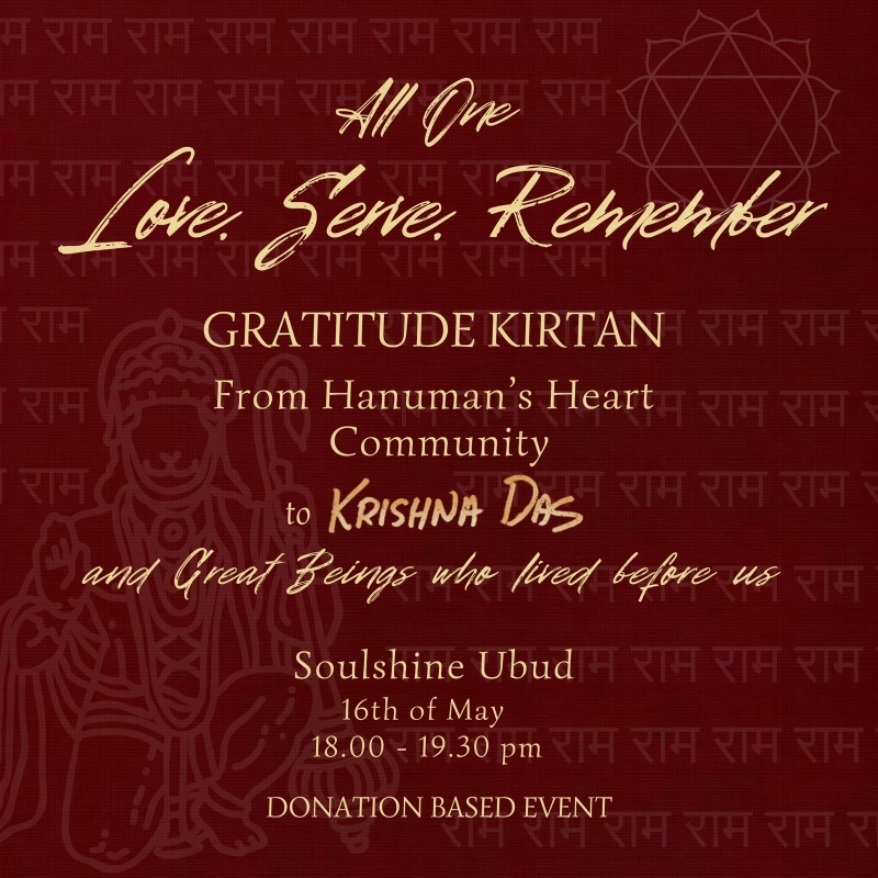 Join us on Thursday, May 16th, 2024, at Soulshine Bali as we come together in devotion and service. For more information about this organization, visit their website: https://www.krishnadas.com/kirtan-wallah-foundation/