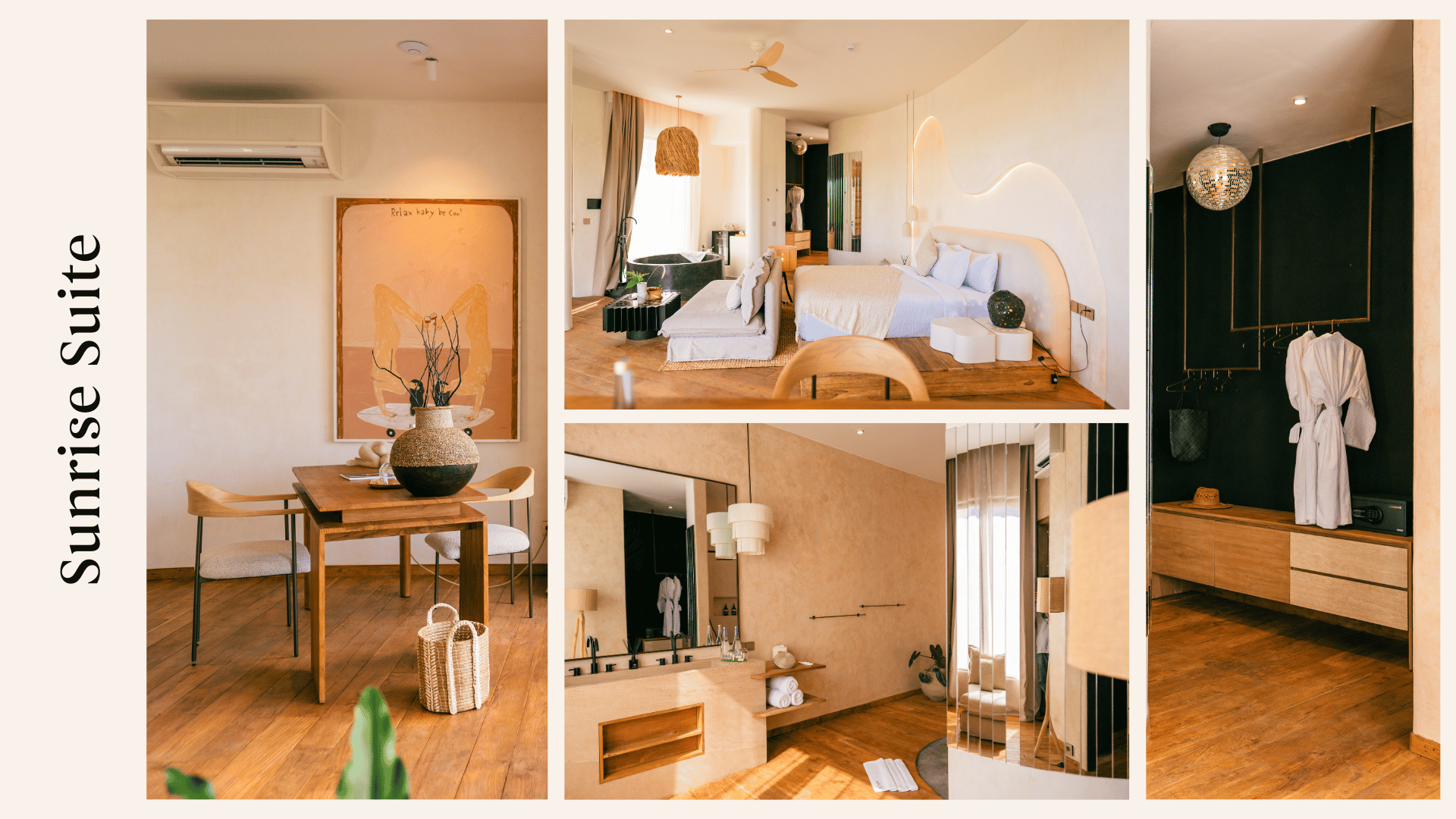 Awaken to tranquility in the Sunrise Suite, overlooking lush landscaped gardens from your private sunbed. Inside, a king-sized bed, a cozy sitting nook, and an elegant bathtub invite moments of rest and reflection. Blending modern sophistication with subtle local artistry, this suite is a serene escape where nature and elegance meet in harmony.