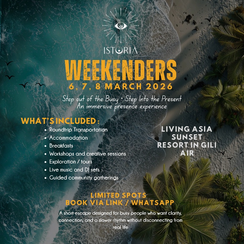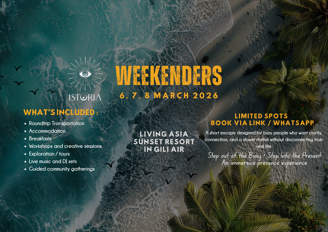 Boat journey to Gili Air, ocean swims, sunset gathering, live music, DJ chill set, sound healing, and fire ceremony to gently land into presence.