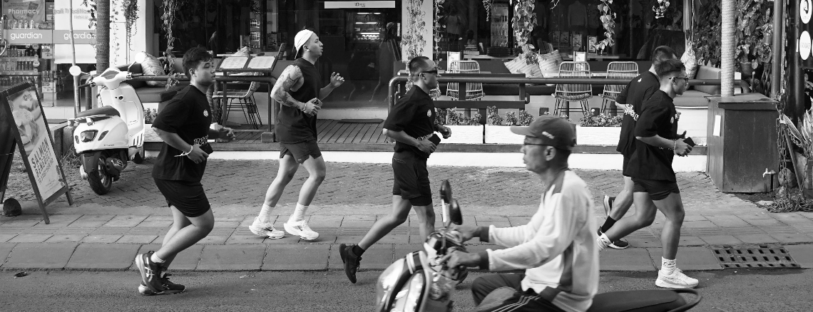 Lace up for a Morning Run through the fields — where the crew links up, the pace is easy, and the path takes us toward the coast. Fresh air, sunrise glow, and streets alive with good energy.