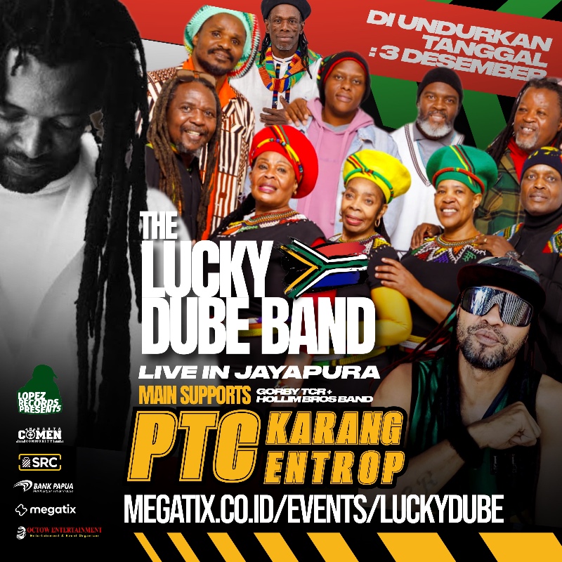 Untuk pertama kalinya, band asli Lucky Dube tampil langsung di Jayapura — grup yang sama yang pernah tampil dan tur keliling dunia bersama mendiang Lucky Dube.