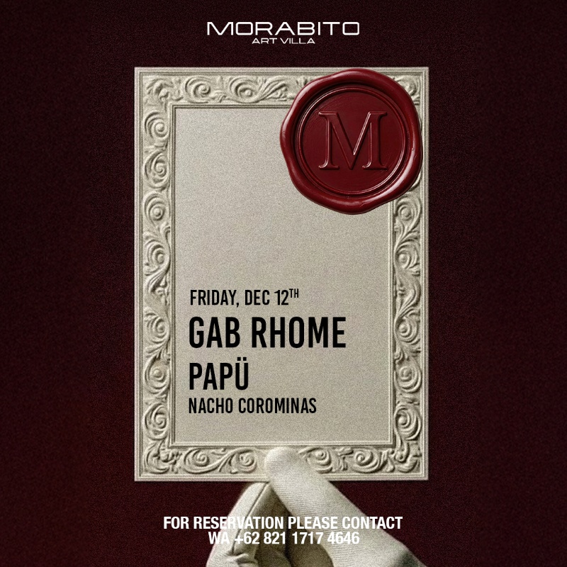 Morabito presents Gab Rhome, a master of rhythm and emotion, Gab Rhome fuses tribal, house, techno, and disco into magnetic sets that have captivated crowds from Space Miami to the Brooklyn Mirage. Followed by Bali's resident DJs, Papü and Nacho Corominas.