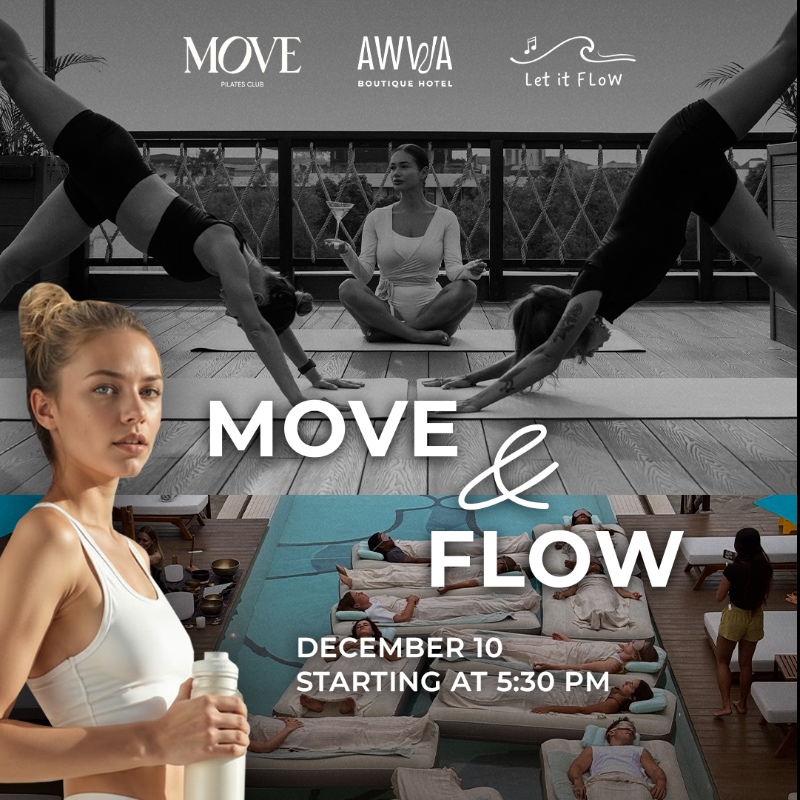 Join us for a unique collaboration between Move Pilates Club, Let It Flow, and Awwa Boutique Hotel — an evening designed to reconnect you with your body, calm your mind, and create space for deep relaxation.
