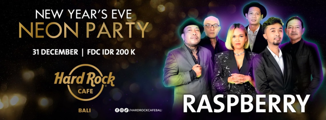 Glow into 2026 at the iconic Hard Rock Cafe Bali at Kuta Beach with Raspberry Band, DJ Bonzo, dancers, bar flair show & non-stop neon vibes.