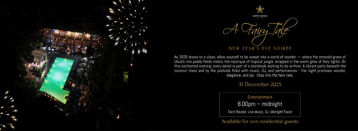 As 2025 draws to a close, allow yourself to be swept into a world of wonder — where the emerald green of Ubud’s rice paddy fields meets the mystique of tropical jungle, wrapped in the warm glow of fairy lights. On this enchanted evening, every detail is part of a storybook waiting to be written. A vibrant party beneath the coconut trees and by the poolside filled with music, DJ, and performances - the night promises wonder, elegance, and joy. Step into the fairy tale