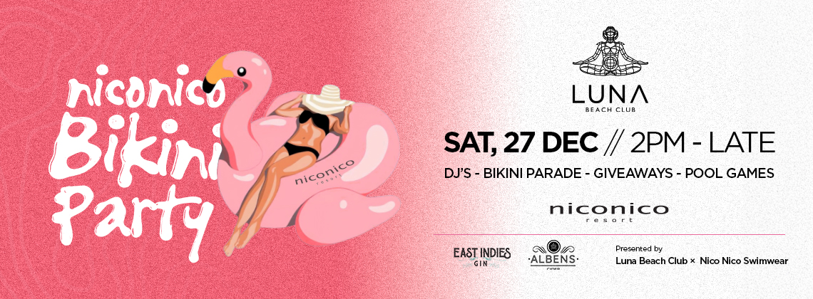 Join us at Luna Beach Club for the NicoNico Bikini Party. A full-day poolside takeover featuring DJs, a bikini parade, pool games, giveaways, and an atmosphere designed for fun from the first splash until late.