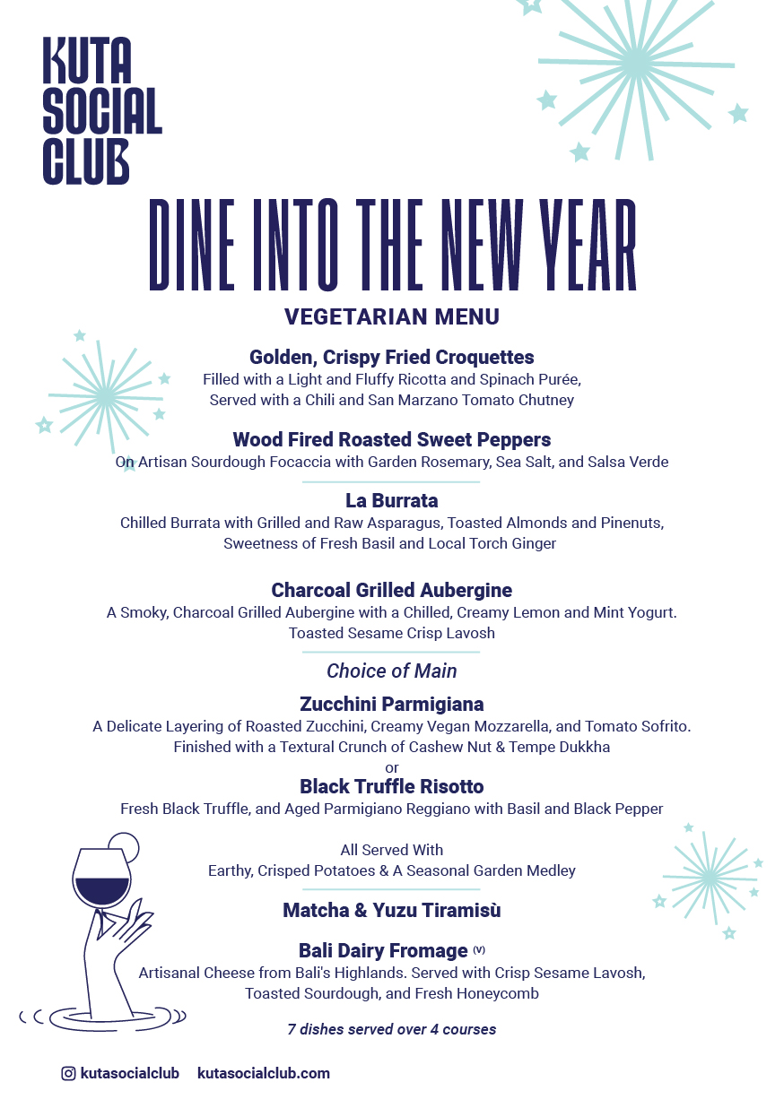 As the countdown to the New Year begins, become part of an evening brimming with excitement, flavor, and festivity at the 'NYE Dinner: Dine Into The New Year'. Join us on December 31st, 2025, at 5:30 PM, in the heart of the vibrant Kuta Social Club, where the stars align for an unforgettable celebration.