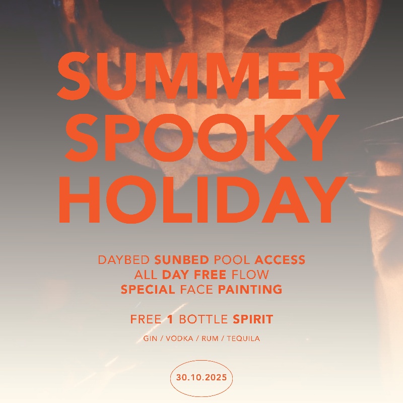 Get ready for a hauntingly unforgettable summer night! Join us for the Summer Ghost Holiday — where the party never dies. Dance to electrifying beats from top DJs, enjoy free face painting, and claim your free bottle of spirit when you book early for a Sunbed, Daybed, or Sidepool table.