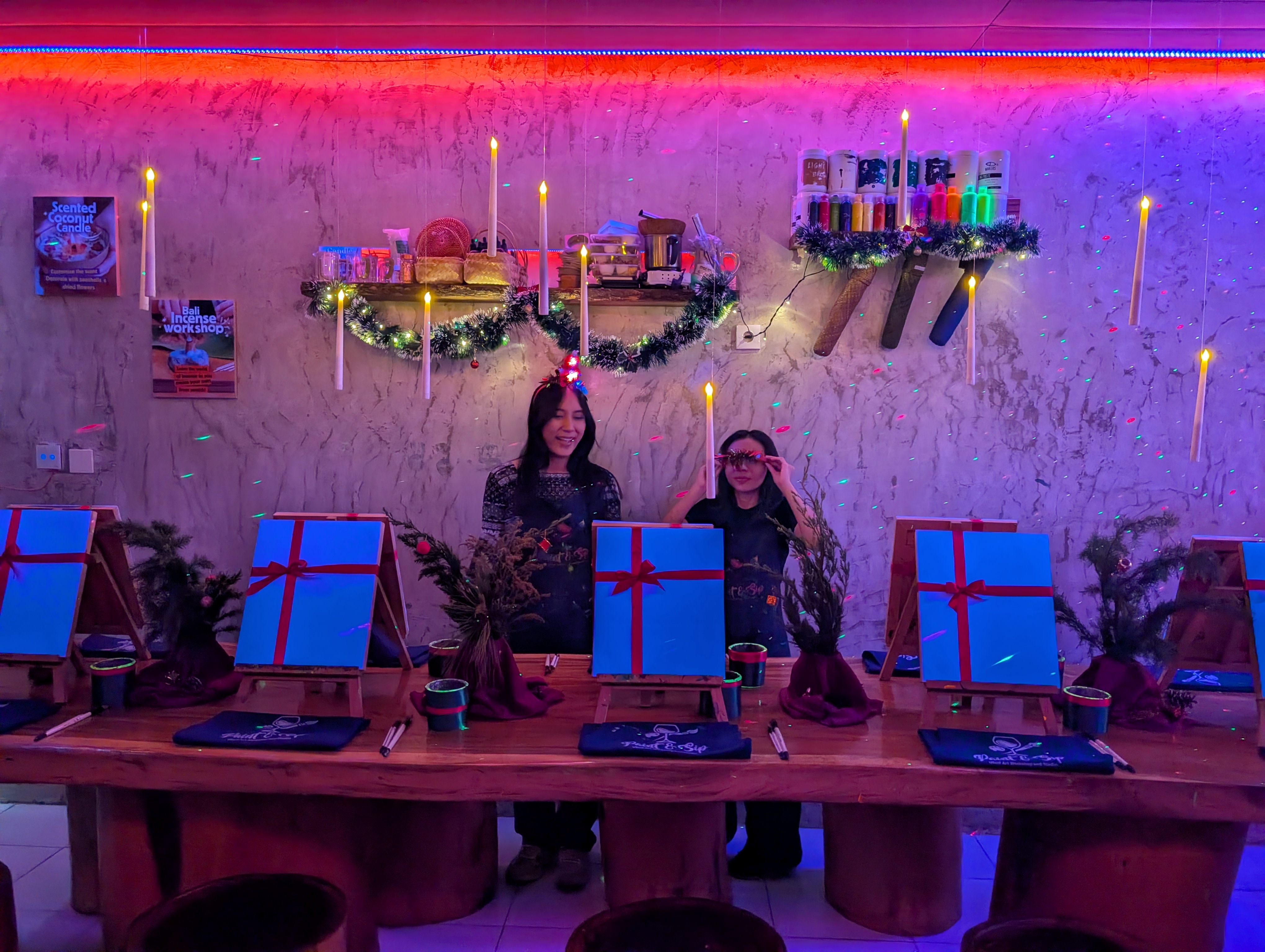 Step into our uniquely decorated studio, featuring magical floating candles and enchanting holiday light show.