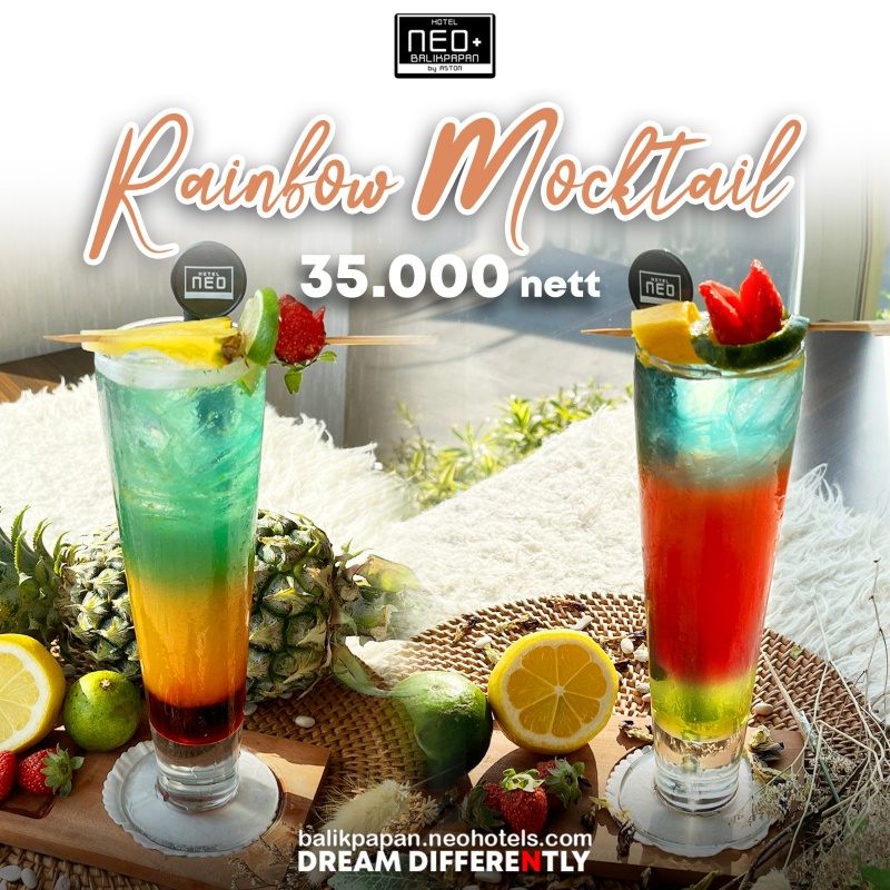 Segarnya minuman Rainbow moctail hanya dengan harga Rp.35.000,-Net!!! Customers dapat menikmatinya di restaurant Noodles Now and Rooftop Terrace & Garden di Lantai 7 . Fan Tekan " 7 " Apabila customer ingin memesan Lewat Room.
