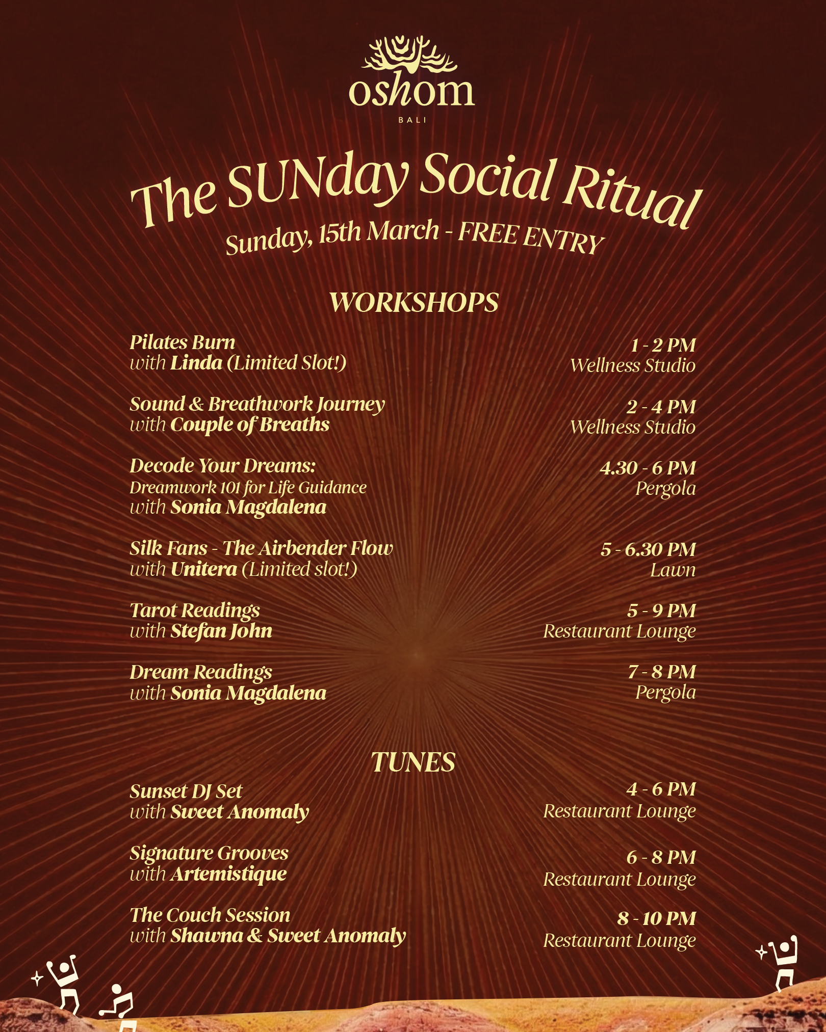 As golden hour arrives, the energy shifts into music with Sunset DJ Sessions by Sweet Anomaly, Signature Grooves with Artemistique and The Couch Sessions with Shawna & Sweet Anomaly — a warm and soulful close to the evening.