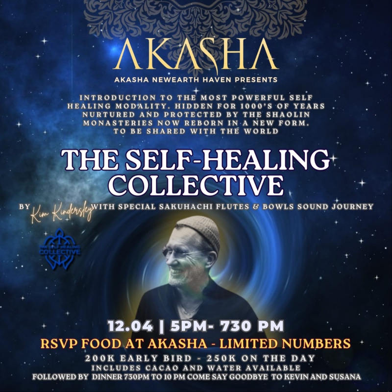 Introducing one of the most powerful self healing modality in the world, mostly hidden for 1000's of years, nurtured and protected by the shaolin monasteries. Reborn in a new form, created by Master Kamen over 8 years years, The Kamen Method is now ready to be shared with the wider world. Movement, Advanced Tapping and Stretching, introducing the cutting edge online course, with the Self Healing Collective, with additional Breathwork, felt sense meditation with Kim Kindersley, and shakuhashi l flute music with special guests. If you are intrigued please come and join us, especially if you have any nagging ailments of mind body, spirit, including all joint issues. This modaility has already changed the lives of 1000's aroud the world. The flow will be about 2.5 hours long, after which we wil celebrate Kevin and Susana's last night in Bali so please come to the flow and recieve a discount of 10% on a la carte in restuarant Akasha. Please RSVP to [email protected] if you are joining just for farewell dinner for kevn and susana at 7.30 on wards last orders at 900pm.