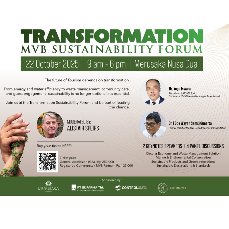 The Transformation – MVB Sustainability Forum is a platform to showcase innovative sustainability solutions and discuss transformative actions in Bali and across Indonesia. The Forum will gather stakeholders from the boarder tourism and travel industries plus related organisations, NGOs, and community organizations to exchange ideas and foster collaboration, with experts in all the relevant sustainability sectors.