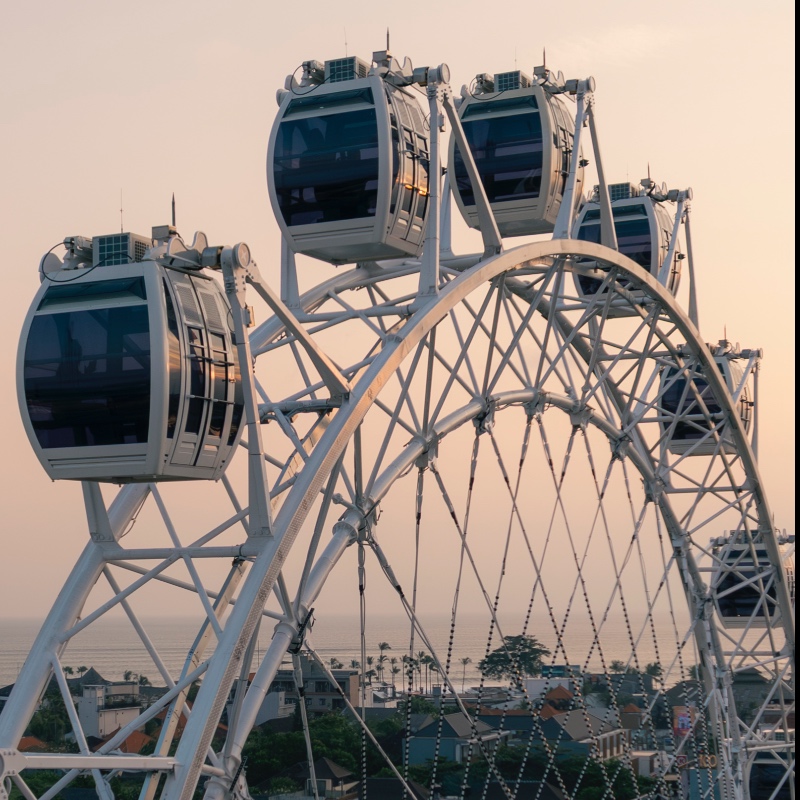 The Wheel Bali is a 42.5-meter-tall observation deck featuring 20 air-conditioned cabins that offer 360° panoramic views of Canggu, the coastline, and Bali’s sunsets. Designed for comfort and safety, it provides visitors with a unique and scenic experience in one of Bali’s most vibrant destinations.