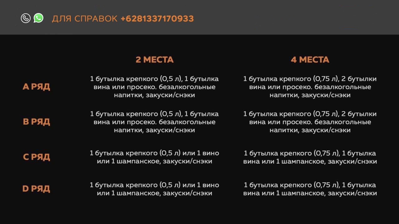 VIP TABLES - места за столиками. Стоимость билета включает сервис официантов, набор закусок и снэков, а также алкоголь (подробнее в описании ниже).
