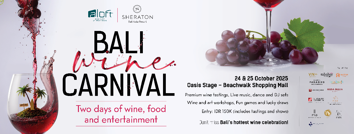 πŸ“… 24 & 25 October 2025 πŸ•“ From 5:00 PM onwards πŸ“ Oasis Stage – Beachwalk Shopping Mall, Bali 🍷✨ Two days of wine, food, and entertainment await you at Bali’s hottest wine celebration! Join us at the Bali Wine Carnival 2025, a collaboration between Aloft Bali Kuta at Beachwalk and Sheraton Bali Kuta Resort, for a vibrant weekend filled with: πŸ‡ Premium Wine Tastings from top wineries 🎢 Live Music, DJ Sets, and Dance Performances 🎨 Wine & Art Workshops 🎲 Fun Games and Lucky Draws Whether you’re a wine lover, foodie, or just looking for a fun weekend out, this event promises a perfect blend of flavors, creativity, and entertainment. πŸ’° IDR 150K per person (includes tastings and shows) This is Bali’s hottest wine celebration – secure your spot now and indulge in a one-of-a-kind experience. Supported by: VIN+, Sababay Winery, Hatten Wines, Paradiso Indonesia, Beachwalk Shopping Center, and more.