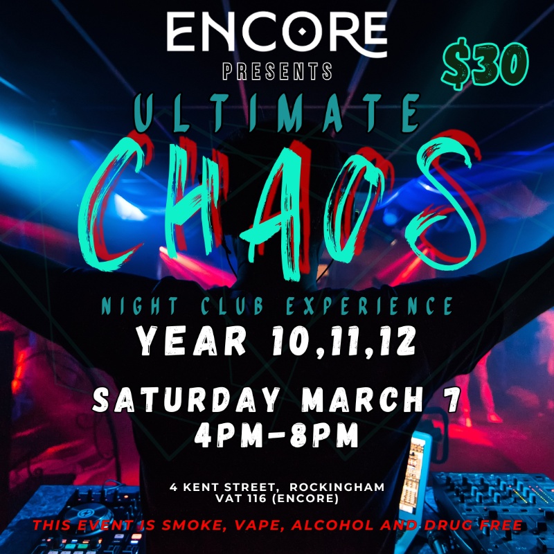 Mark your calendars for the ultimate teen takeover as CHAOS - Teen DJ Party hits Encore Rockingham! Wave goodbye to your regular Saturday routines because it's time to unleash @ ENCORE !!
